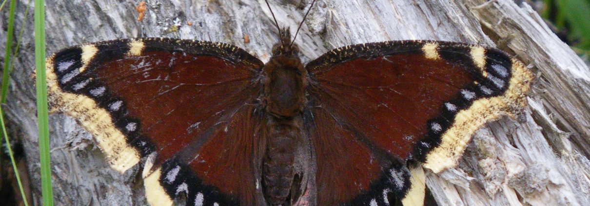 How long do butterflies live? For most, the answer is “not very long,” after what may have been many months as an egg, caterpillar, and chrysalis. For the Mourning Cloak (Nymphalis antiopa), however, life as a butterfly can stretch over an entire year. Mourning Cloaks spend the winter in hibernation, under bark for example, and they are often the “first butterfly of spring,” along with their close relatives, the tortoiseshells and commas. Since Mourning Cloaks are widespread in North America and Eurasia, they are probably the most oft-encountered spring butterflies in the north temperate world. After feeding on various trees (elm, willow, and poplar are all acceptable fare) as caterpillars, Mourning Cloak butterflies emerge from their pupae in mid to late summer. They sometimes live as long as twelve months as adults. In springtime, they typically emerge from hibernation before the first flowers are in bloom, and they feed on everything from sap flows to dung to mud, in order to obtain the nutrients necessary for such a long life.